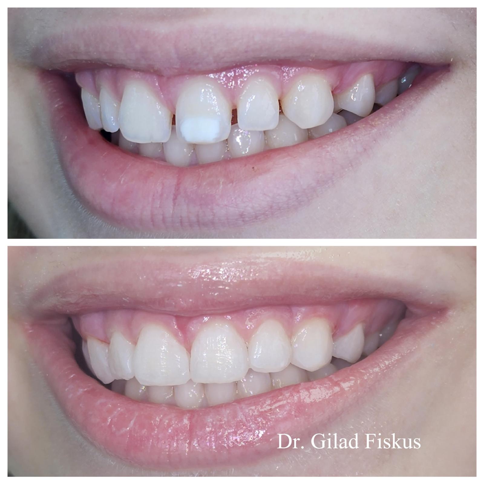 קומפוזיט הוא חומר סינתטי, למעשה זה החומר שעושים איתו סתימות לבנות ומאפשר ל ד״ר גלעד פיסקוס, לשחזר את המראה והצורה של השיניים הטבעיות בצורה מדויקת.